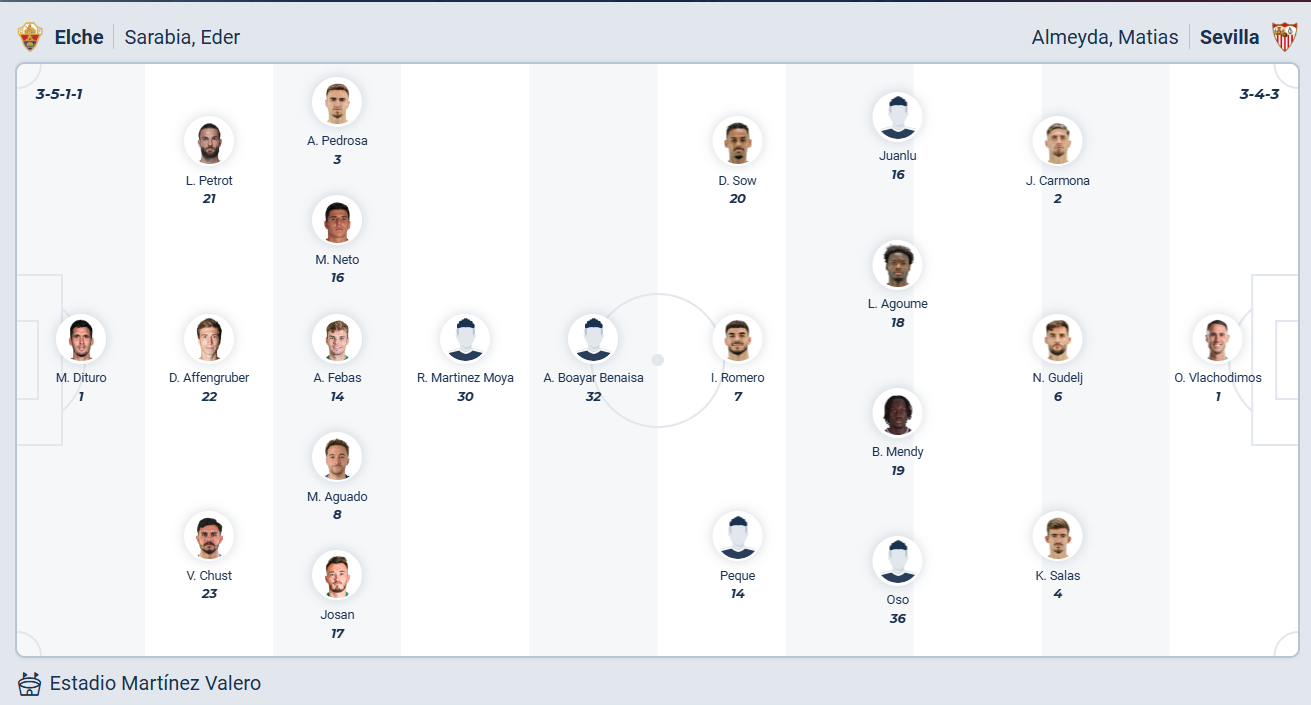Sevilla hiện tại chỉ là đội bóng trung bình yếu của La Liga, họ liên tục đứng ở nửa sau bảng xếp hạng ở các mùa gần đây. Mùa này họ đã tụt xuống thứ 14 sau khi để thua cả 3 trận gần nhất, các cầu thủ Sevilla rất cần một chiến thắng để cải thiện thứ hạng của mình. Họ muốn có được điều đó khi đến làm khách trên sân của Elche, tuy nhiên với phong độ và chất lượng đội hình như hiện tại thì mọi thứ rất khó khăn. Nhiều khả năng Sevilla sẽ không có được kết quả tốt ở vòng đấu này và tiếp tục khủng hoảng.